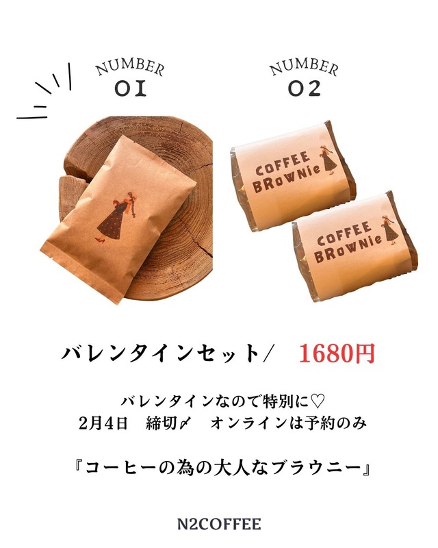こちらの商品はゆうパケットポストにての お届け 郵便ポストに入ります (現品+送料300円いただいております) 店頭受け取りの方はこちらより↓ https://n2coffee.base.ec/items/13308800 単品で購入はこちら↓ ・バレンタインブレンド https://n2coffee.base.ec/items/132841338 ・コーヒーブラウニー https://n2coffee.base.ec/items/132728885 内容 ・コーヒーブラウニー 2個 (賞味期限 2026年 2月19日) ・バレンタインブレンド 100g or ドリップバッグ5個 (ドリップバッグに変更の場合オプションより) ドリップバッグ(透過タイプ) -ブラウニーのご紹介- 今回の焼菓子の 製造KAWAKIYOCOFFEEさんに、 限定製造をお願いしました バレンタインだけのブラウニーなので 是非この機会に お試しいただけますと幸いです バレンタインコーヒーの為のブラウニー クーベルチュールチョコレートをたっぷり使用 コーヒーとカルーアも後味に感じられ ピーカンナッツとしっとりの 触感もお楽しみください 成分 -クーベルチュールチョコ -卵 -バター -グラニュー糖 -小麦粉 -牛乳 ‐コーヒー -生クリーム -食塩 -ベーキングパウダー -バレンタインブレンド- コロンビア ブラジル ケニア ウガンダ 4種類のブレンド コクリッチな味わい 今回も高品質なロブスタ(ウガンダ産)を入れてます ウガンダのロブスタを取り扱いするのは 3年ぶりで、非常に状態が良いです ブレンドのボディを作るには欠かせない エスプレッソでも是非道具がある方はお試しください